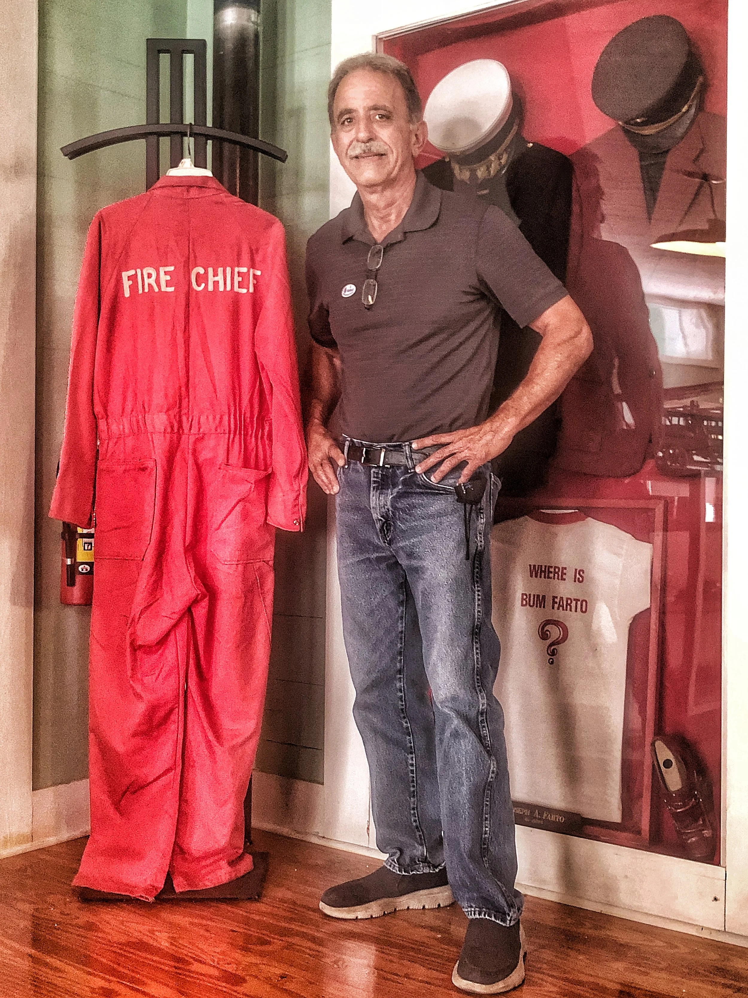 Alex Vega holds up a uniform worn by 1975 Fire Chief Bum Farto, on display at the Key West Firehouse Museum. The museum will be honored with “Bum Farto- The Musical” and the Sizzling 70s Opening Night Gala, with proceeds to benefit the nonprofit museum located on Virginia and Grinnell Streets. The show is a hilarious true crime musical that tells the tale of an infamous fire chief who tempted fate and federal agents who set him up in a drug sting known as Operation Conch and opens at the San Carlos Institute Theater in Old Town, Key West on Thursday, October 13 through October 27. Bumfartothemusical. Image by Cricket Desmarais